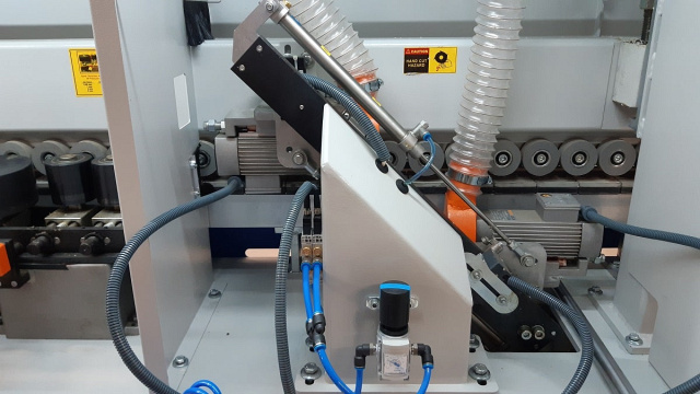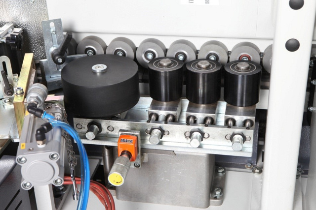 ![]() | Пресс группа Тяжелая зона прижима оснащена главным прижимным роликом диаметра Ø120 и тремя допрессовочными роликами. Длинная зона прижима гарантирует окончательную кристаллизацию клея перед механической обработкой для исключения сдвига кромки и минимизирует клеевой шов, делая его идеальным. С помощью цифрового счетчика регулируется прижим на разную толщину кромочного материала. Усилие пресс группы задается механически, что позволяет качественно приклеить кромочный материал к детали. Значение прижима кромки от толщины отображается на цифровом счетчике. |
