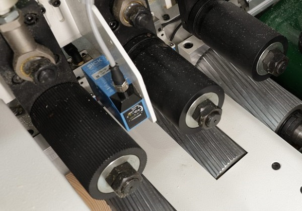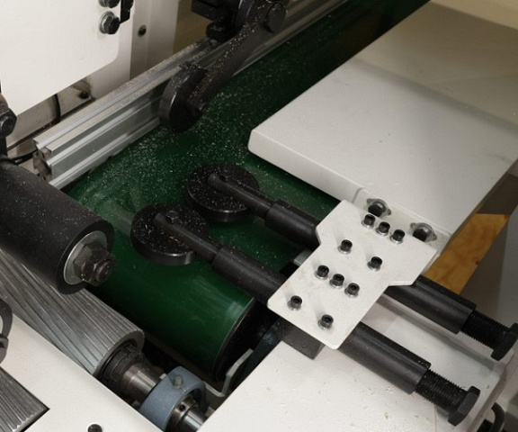 Увеличенное количество на станке приводных нижних рифленых роликов в столе - 6 штук и обрезиненных верхних роликов с пневматическим прижимом - 6 штук. Обеспечивают стабильную подачу и точное позиционирование заготовки для резания во время остановки.