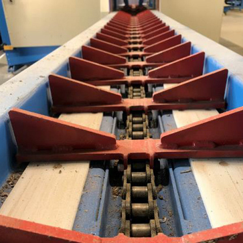 ![]() | Приемный транспортер На выходе из станка так же установлен цепной траковый транспортер. Позволяющий отводить кряжи длиной от 900 мм. Длина приемного транспортера 2300 мм. |