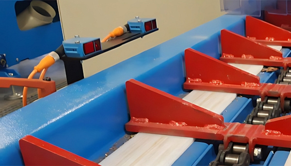 ![]() | Выставление размера Размер получаемых кряжей задается высокоточными датчиками, расположенными на выходном транспортере. Датчики перемещаются по линейной направляющей. |