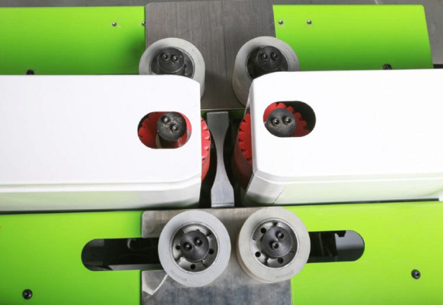 ![]() | Подающие ролики Станок имеет четыре независимых подающих ролика, два на входе, и два на выходе. Каждый ролик оснащен отдельным двигателем. Скорость подачи синхронизирована, плавно регулируются с помощью инвертора. Такая конструкция позволяет подавать прямые и изогнутые заготовки, постоянного и переменного сечения. |