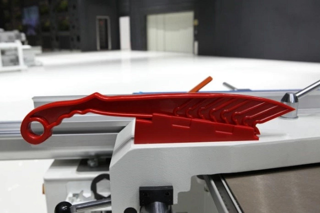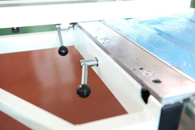 Управление продольным упором осуществляется через ЧПУ контроллер. Сам упор перемещается посредством сервомотора Oriental Motor (Япония), высокоточной шарико-винтовой пары и линейной направляющей. Все это обеспечивает точность 0,1 мм и плавность движения упора. Скорость перемещения до 15 м/мин. Для безопасности работы станок оснащен системой защиты от столкновения упора с полотном пилы или защитным колпаком.