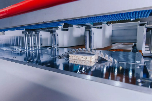 Автоматическая настройка вылета основной пилы и прижимной балки от толщины пакета позволяет увеличить производительность во время работы станка за счет сокращения расстояния холостого хода прижимной балки и вылета пилы.