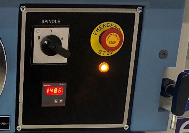 ![]() | Панель управления На панели расположены: переключатель звезда/треугольник включения станка, аварийный выключатель, маховик подъема/опускания шпинделя, электронный счетчик положения шпинделя и рукоятка стопора шпинделя при смене инструмента. |