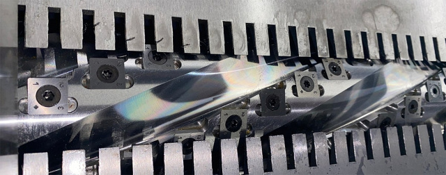 ![]() | Спиральный ножевой вал Имеет 6 спиралей твердосплавных пластин. Пластина имеет 4 рабочие грани. Каждая грань пронумерована. |