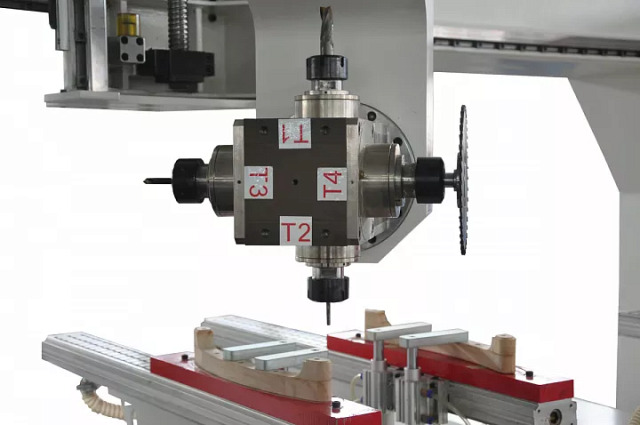 Два шпинделяс выходом на две стороны, имеют цанговые зажимы ER40 и максимальную частоту вращения ротора 24 000 об/мин. Мощность каждого шпинделя 7,5 кВт. Данная конфигурация позволяет одновременно использовать 4 инструмента и производить его смену между операциями за 1 - 2 секунды для максимальной производительности. Экономия времени на смену инструмента особенно важна при изготовлении изделий с коротким циклом обработки.