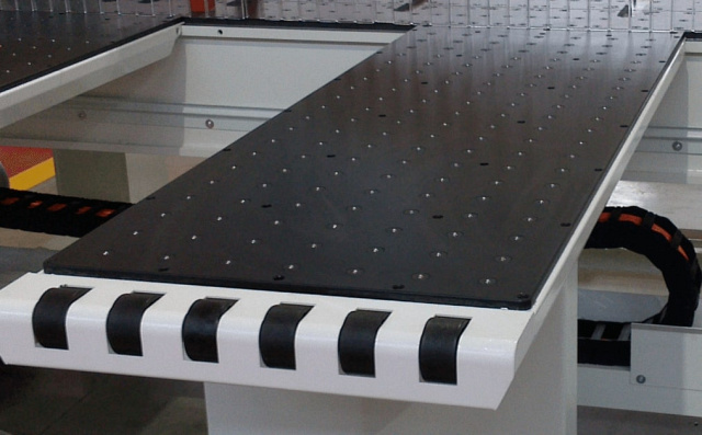 ![]() | Рабочий и загрузочные столы Основа рабочего стола — стальной лист, толщиной 20 мм, что гарантирует отсутствие прогибов и абсолютную ровность опорной поверхности. Поверхность рабочего и загрузочных столов оснащена системой воздушного поддува и позволяет перемещать пакеты заготовок до 7 листов без повреждения лицевых поверхностей. Благодаря удлиненным пазам для захватов на рабочем столе, толкатель может перемещаться за линию реза. Таким образом станок позволяет использовать всю полезную площадь листов материала. |