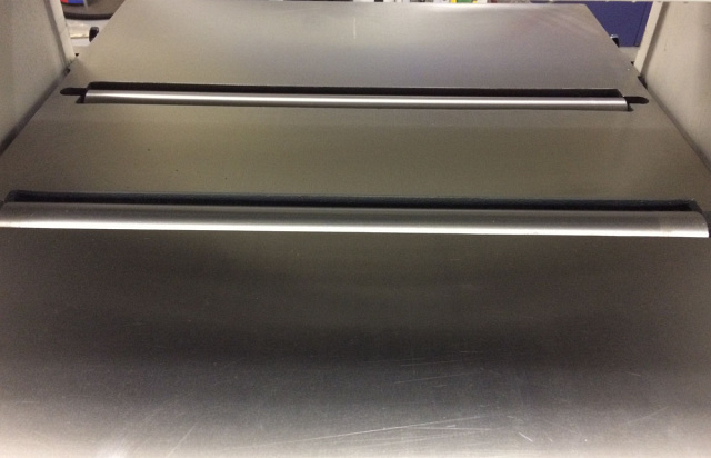 Стол перемещается в 4-х направляющих, что исключает его перекос. Жесткая фиксация стола осуществляется с помощью рукояток.