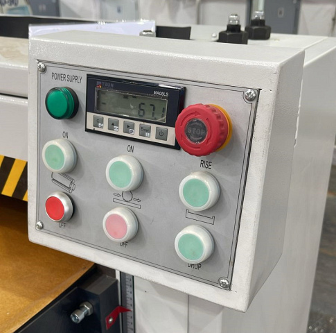 На пульте расположен дисплей с электронной индикацией положения стола, а также кнопки включения/выключения ножевого вала и подающих вальцов, подъема/опускания стола и кнопка аварийной остановки.