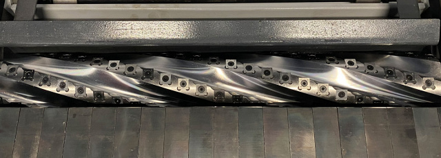 ![]() | Спиральный ножевой вал Ножевые пластины расположены по спирали. Это обеспечивает плавный вход ножей в заготовку и исключает ее подрывы, что повышает качество обработанной поверхности. Вал имеет 6 спиралей твердосплавных пластин. |