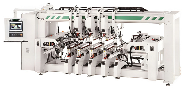 Автоматический 10 траверсный сверлильно-присадочный станок проходного типа предназначен для сверления за один проход сквозных и глухих отверстий в торцах и в пласте деталей корпусной мебели при массовом производстве мебели.
