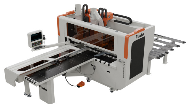 Filato Drillmatic 612-3H - это современный трёхголовый высокоскоростной сверлильно-присадочной центр с ЧПУ, предназначен для высокоточного сверления сквозных и глухих отверстий в торцах и плоскостях мебельных щитов с 6 сторон, а также выборки пазов при помощи пазовальной пилы и фрезерной обработки с помощью двух фрезерных агрегатов.