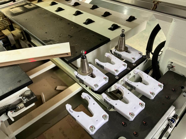 ![]() | Верхний сверлильный блок 18 вертикальных шпинделей для сверления в пласть 10 горизонтальных шпинделей для сверления в торцы (3 + 3; 2 + 2). Независимый пазовальный агрегат по двум осям Х и У – 1,7 кВт, 1700 об/ мин. Усиленный угловой редуктор, что позволяет использовать его в более длительных и нагруженных обработках, в отличии от пазовых пил установленных непосредственно в присадочной голове. Электрошпиндель фрезерного узла 5,5 кВт, 18 000 об/мин. С автоматической сменой инструмента. |