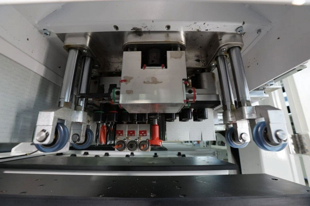 Управляемые шиберы на аспирационных патрубках, централизованная система смазки, быстросъемные кожухи на сверлильных головах, дублирование кнопок управления, обдув рабочей зоны столов, оптических датчиков, центральный базирующий упор прямоугольного сечения, датчик измерения длины.